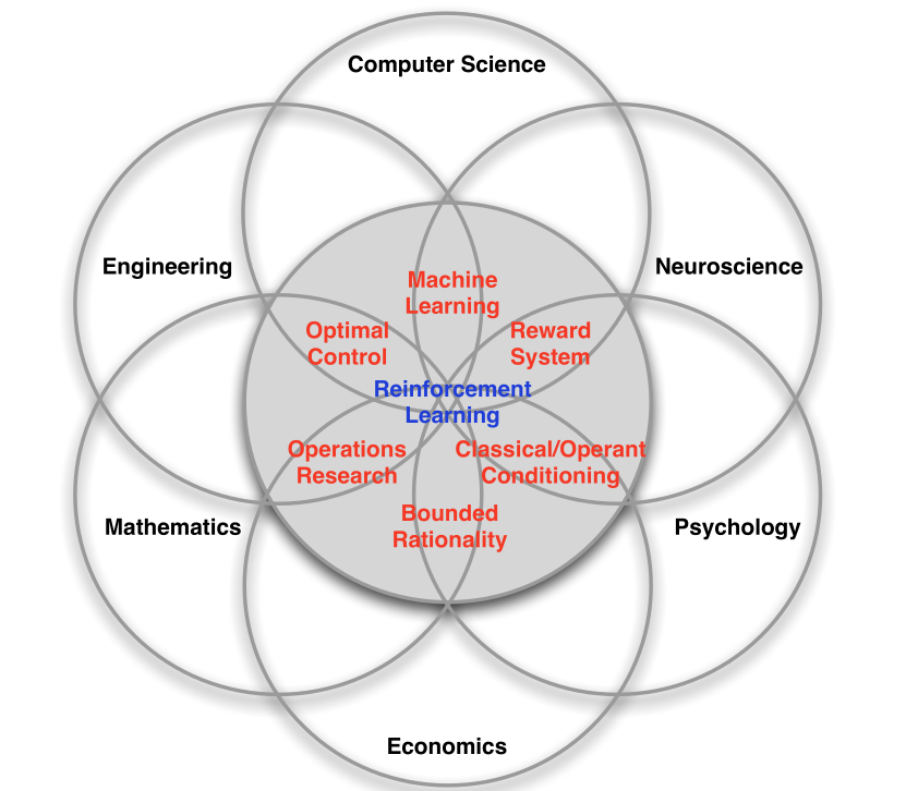 Reinforcement learning comes from animal behavior studies, especially operant conditioning / instrumental learning.