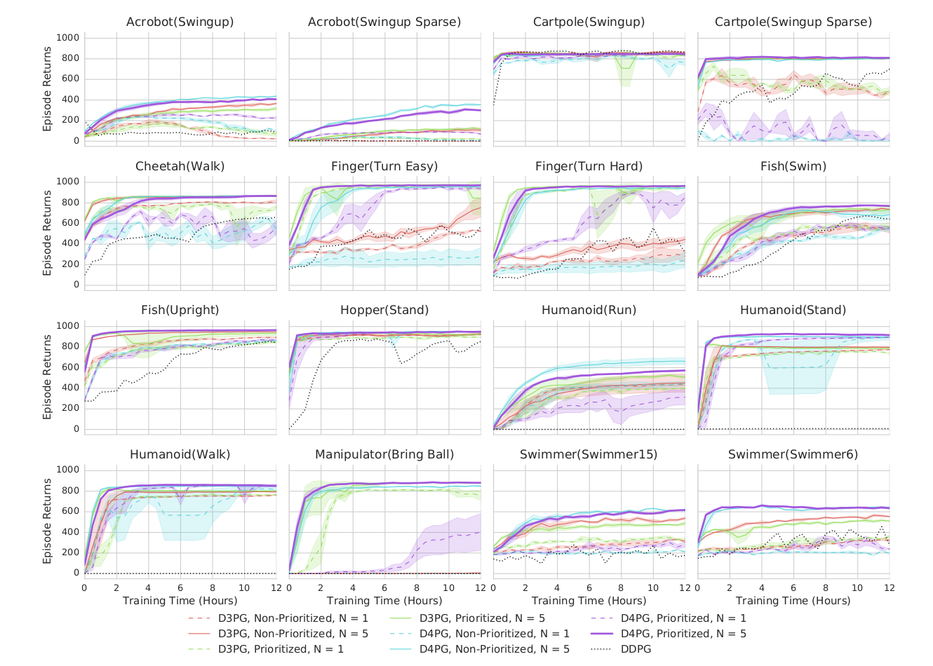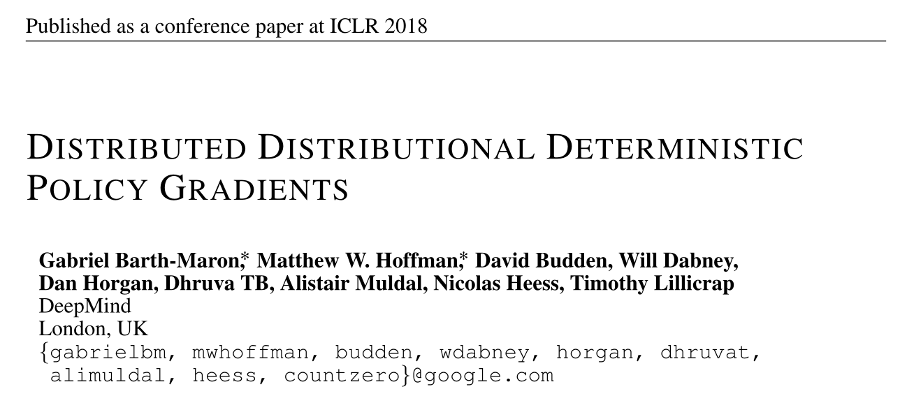 Barth-Maron, G., Hoffman, M. W., Budden, D., Dabney, W., Horgan, D., TB, D., et al. (2018). Distributed Distributional Deterministic Policy Gradients. arXiv:1804.08617.