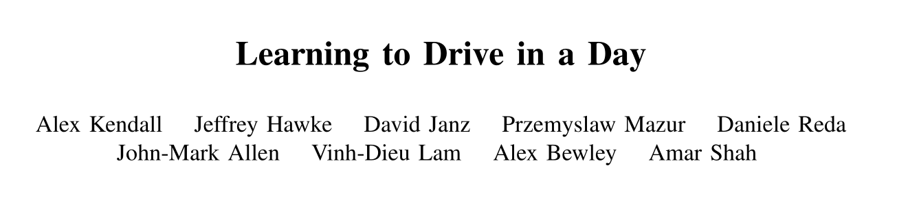 Kendall, A., Hawke, J., Janz, D., Mazur, P., Reda, D., Allen, J.-M., et al. (2018). Learning to Drive in a Day. arXiv:1807.00412