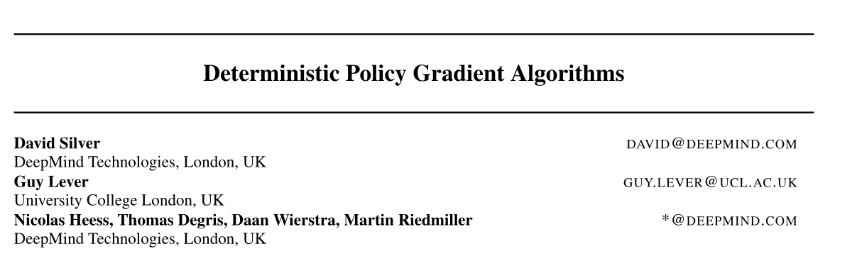 Silver, D., Lever, G., Heess, N., Degris, T., Wierstra, D., and Riedmiller, M. (2014). Deterministic Policy Gradient Algorithms. ICML.