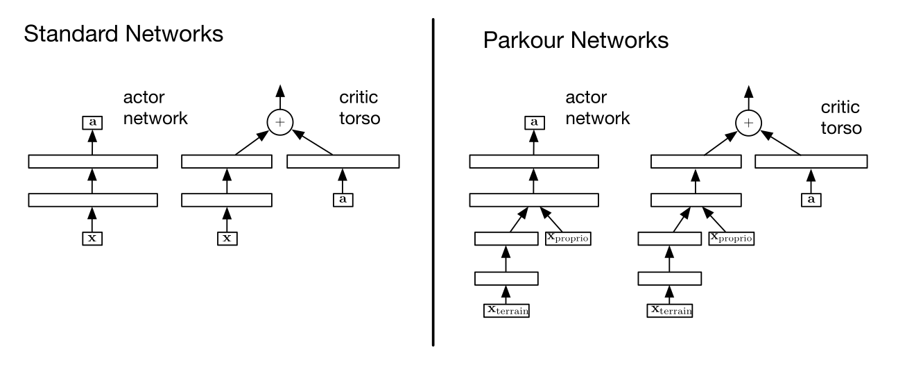 For Parkour tasks, the states cover two different informations: the terrain (distance to obstacles, etc.) and the proprioception (joint positions of the agent).