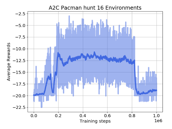 Policy collapse happens when the bias of the critic is too high for the actor. Example with A2C: