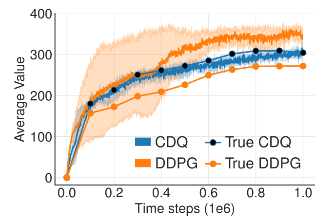 As any Q-learning-based method, DDPG overestimates Q-values.