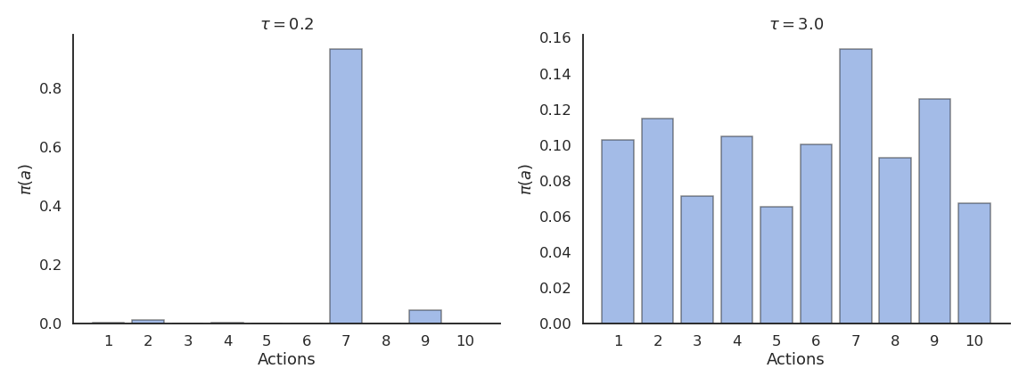 \pi(s, a) = \frac{\exp Q(s, a) / \tau}{ \sum_b \exp Q(s, b) / \tau}