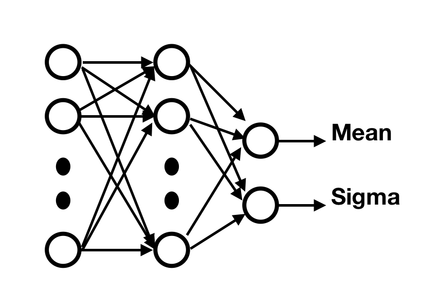 \pi_\theta(s, a) = \frac{1}{\sqrt{2\pi\sigma^2_\theta(s)}} \, \exp -\frac{(a - \mu_\theta(s))^2}{2\sigma^2_\theta(s)}