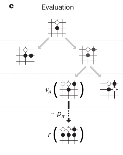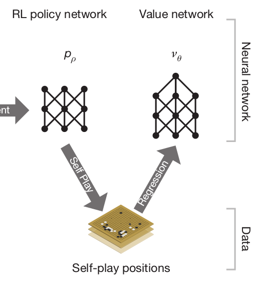 A value network \nu_\theta finally learns to predict the outcome of a game (+1 when winning, -1 when losing) based on the self-play positions generated by the RL policy network.