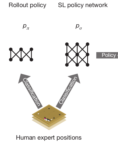 The rollout policy and the SL policy network use supervised learning to predict expert human moves in any state.