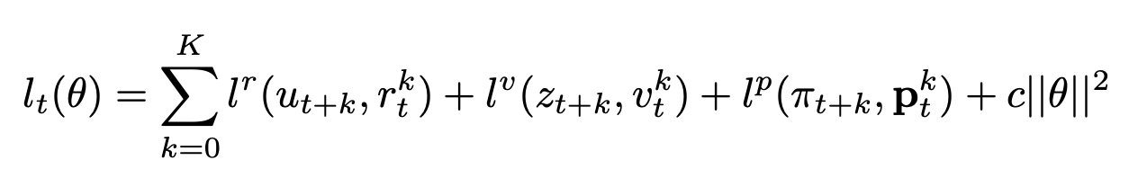 \mathcal{L}(\theta) = (R − V_\varphi(s))^2 - \pi_\text{MCTS}(s) \, \log \pi_\theta(s) + c ||\theta||^2