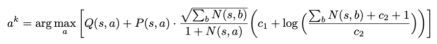a_t = \text{argmax}_a \, Q(s, a) + K \cdot \frac{P(s, a)}{1 + N(s, a)}