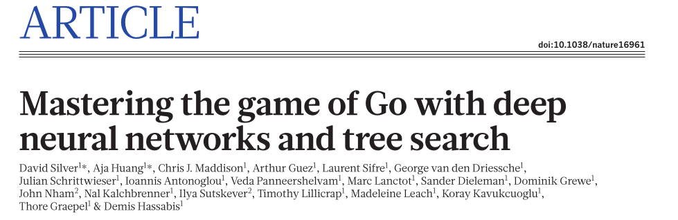 David Silver et al. (2016). Mastering the game of Go with deep neural networks and tree search. Nature, 529(7587):484–489, arXiv:1712.01815.