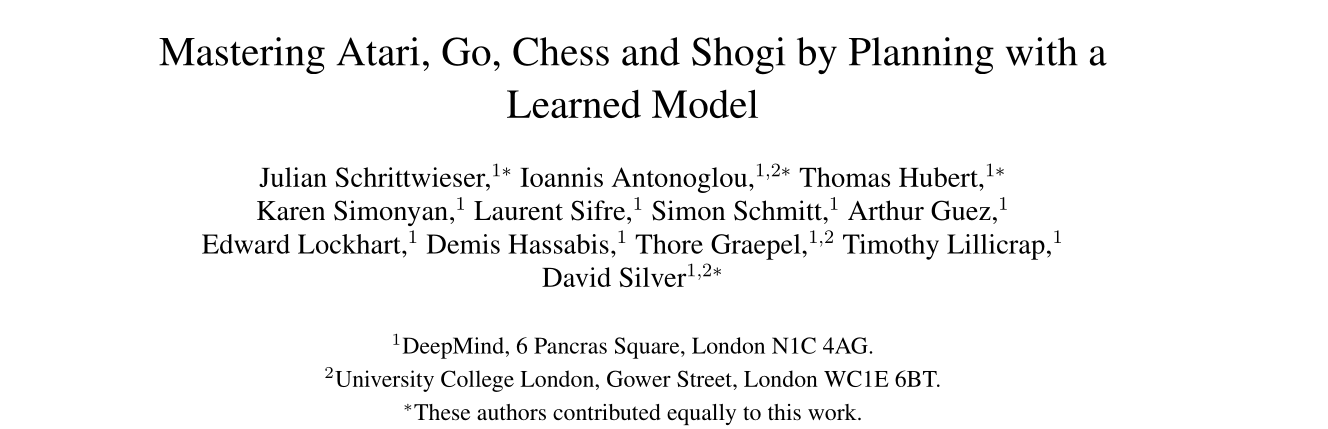 Schrittwieser et al. (2019). Mastering Atari, Go, Chess and Shogi by Planning with a Learned Model. arXiv:1911.08265