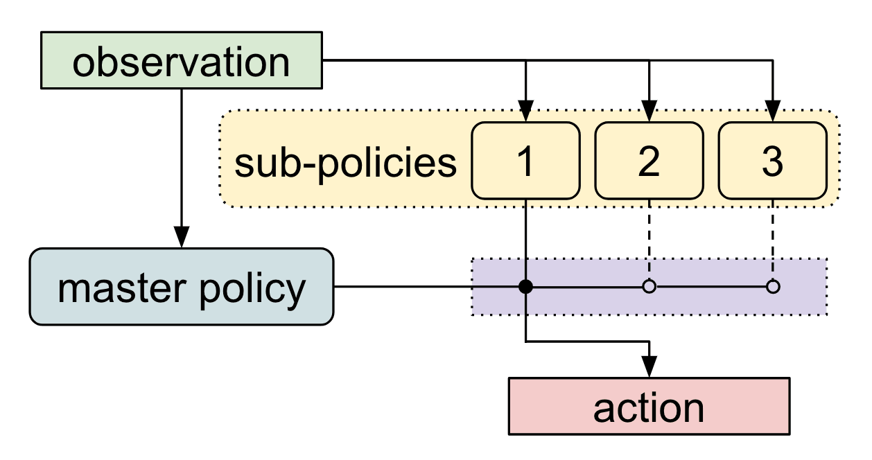 A meta-learner or controller then learns to call each sub-policy when needed, at a much lower frequency.