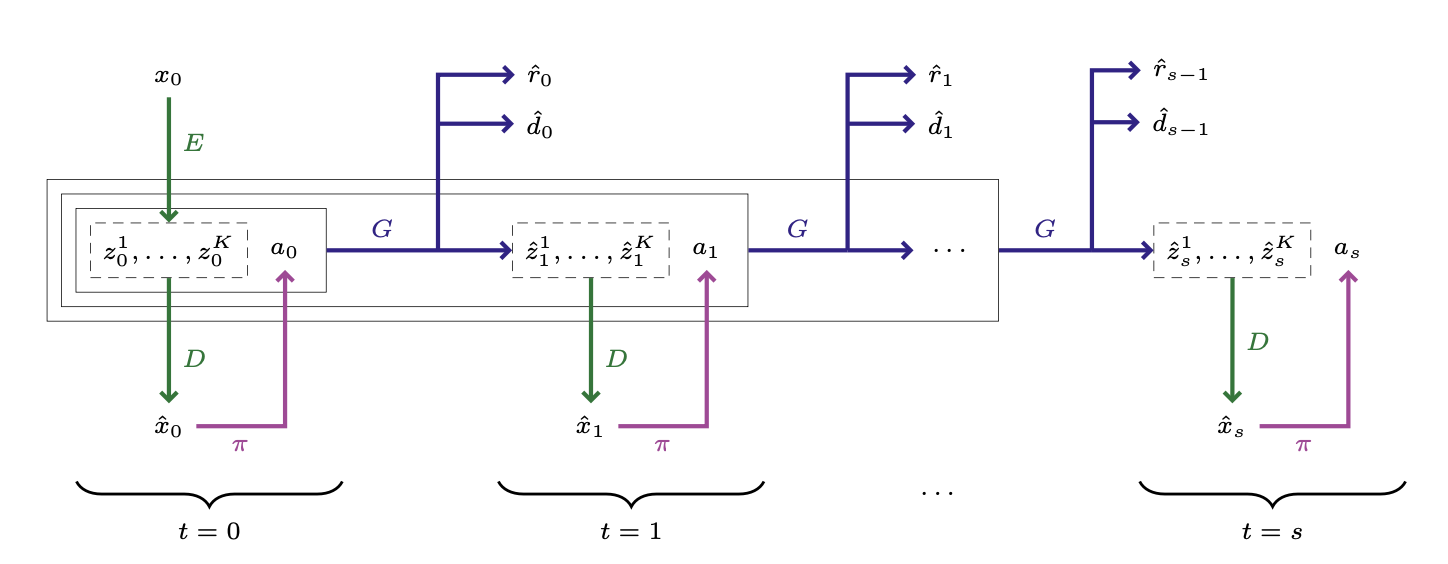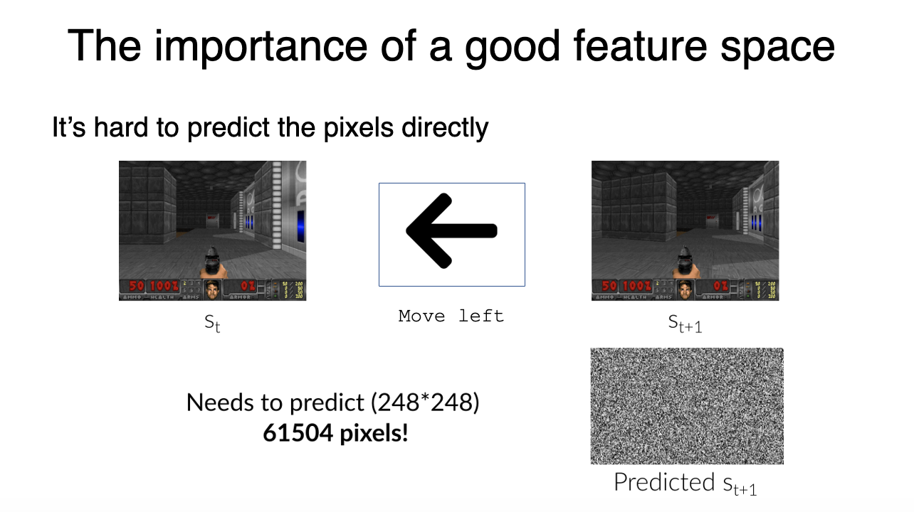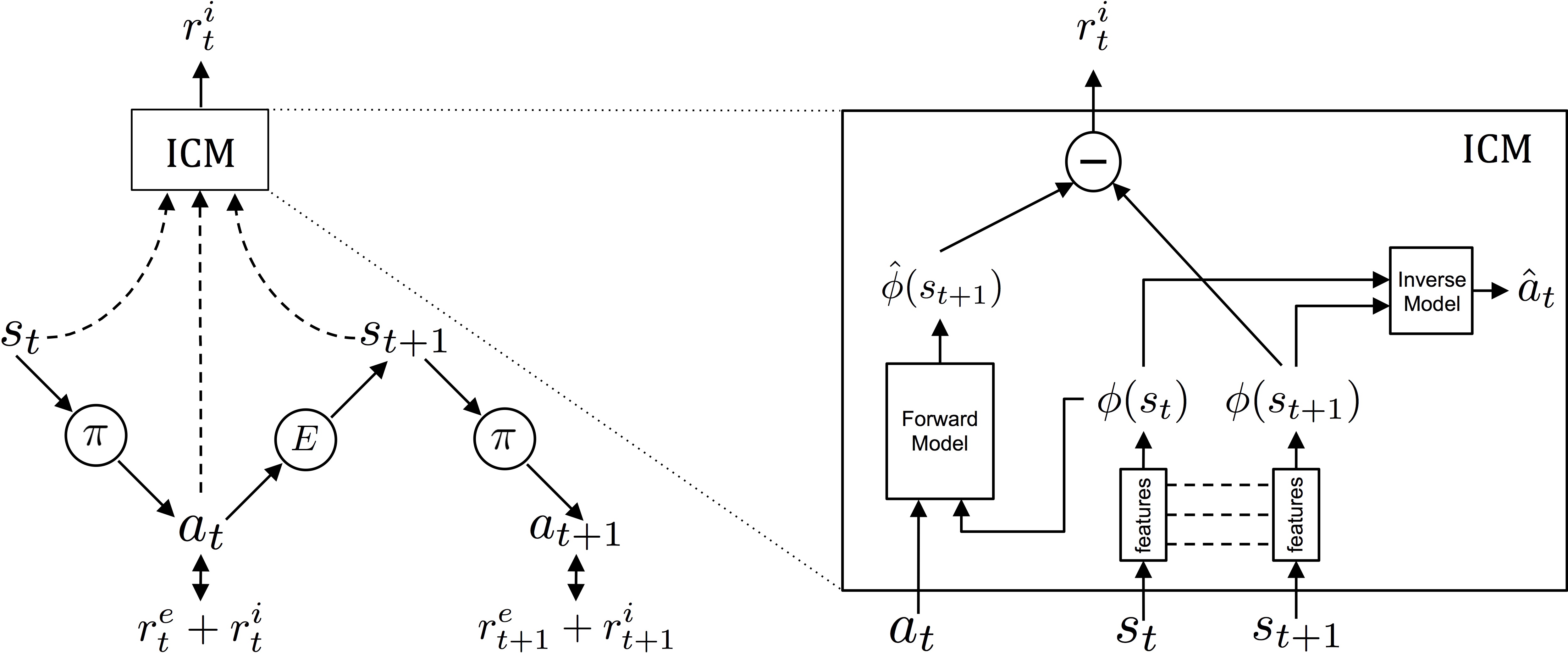 The intrinsic curiosity module (ICM) learns to provide an intrinsic reward for a transition (s_t, a_t, s_{t+1}) by comparing the predicted latent representation \hat{\phi}(s_{t+1}) (using a forward model) to its “true” latent representation \phi(s_{t+1}).